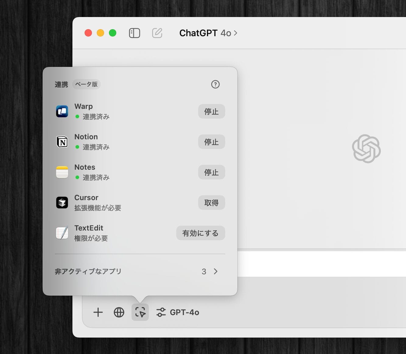 そんなChatGPTユーザーたちの悩みを解決してくれる新機能が、「Work with Apps (アプリ連携)」機能である。