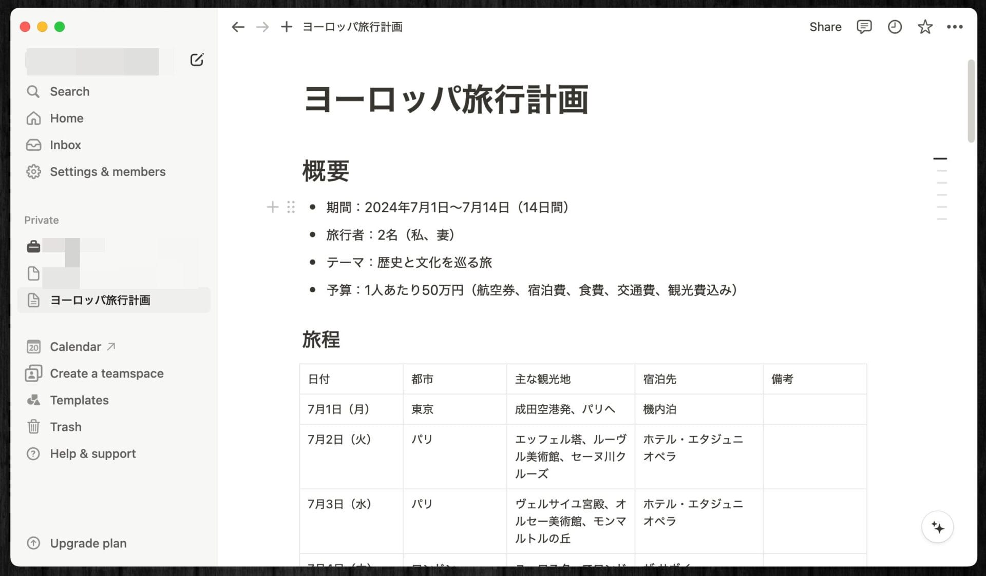 サンプルとして、Notionアプリ内に、ヨーロッパ旅行計画のドキュメントを作成してみた。ドキュメント内には旅程や行き先の候補、どのような目的の旅かなどが記載されている。