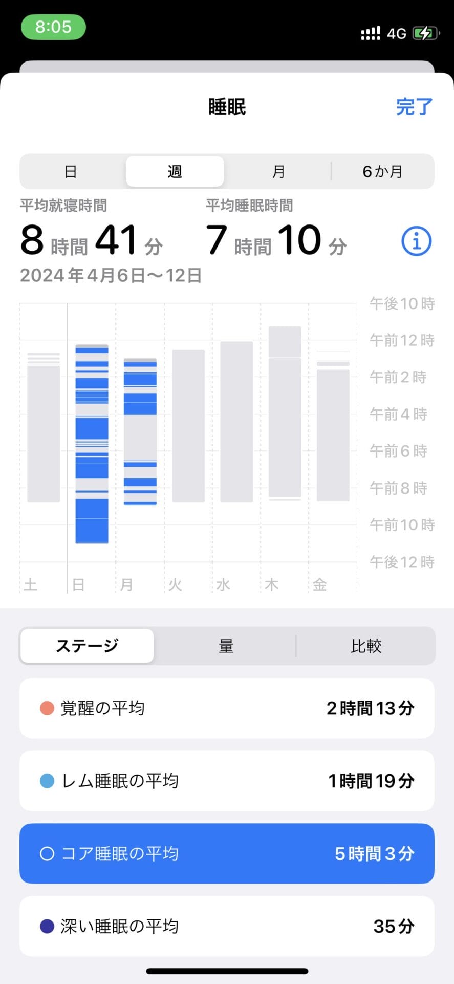 ちなみに、純正の「ヘルスケア」アプリにも、Apple Watchを身につけて寝た日については、「睡眠ステージ」という項目で就寝時間や、レム睡眠、コア睡眠、深い睡眠の時間を表示する機能がある。