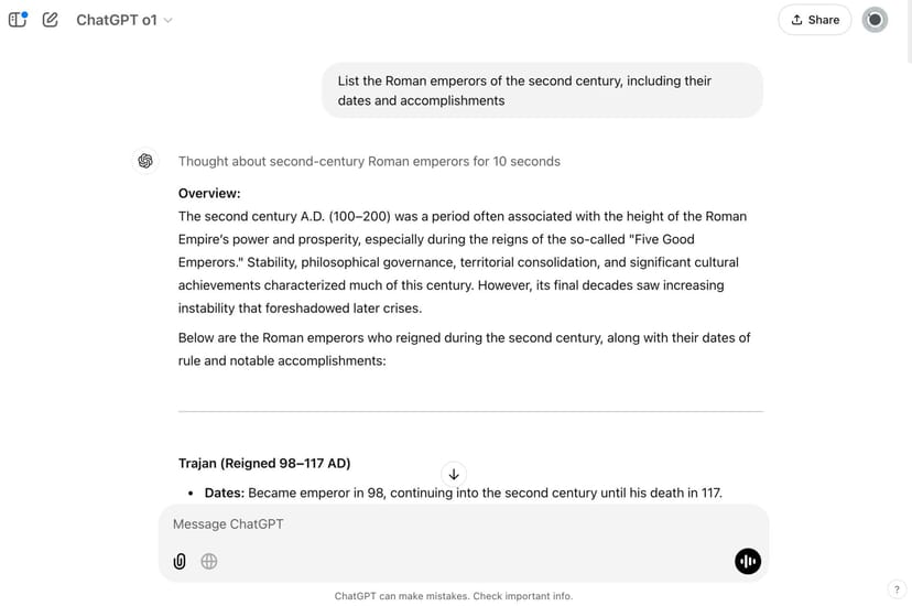 ライブ配信では、o1-previewとの性能比較のデモとして、o1がローマの皇帝をより高速で正確に列挙する様子が紹介された。