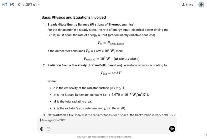 また、画像解析のデモとして、手書きのメモで宇宙空間にあるデータセンターの冷却面積の計算問題をo1に読み込ませると、約10秒で冷却面積の推定計算を行う様子が紹介された。