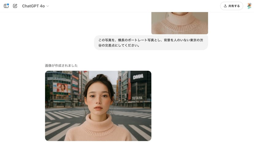 この写真を、横長のポートレート写真とし、背景を人のいない東京の渋谷の交差点にしてください。背景が「人のいない渋谷交差点」というかなり特殊なシナリオなので、難易度が高い指示のように思えるが、以下のようにバッチリ注文通りに生成してくれた。