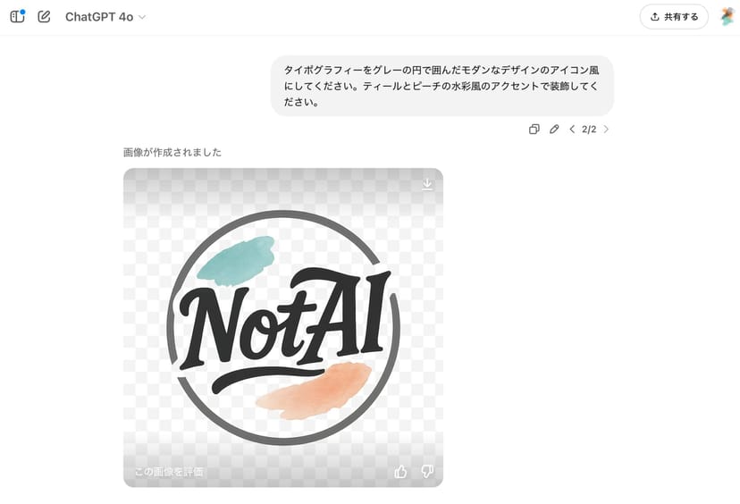 タイポグラフィーをグレーの円で囲んだモダンなデザインのアイコン風にしてください。ティールとピーチの水彩風のアクセントで装飾してください。すると、先に生成したタイポグラフィーを崩すことなく、指示を的確に守りながら、アイコン風にアップデートしたpng画像を生成してくれた。