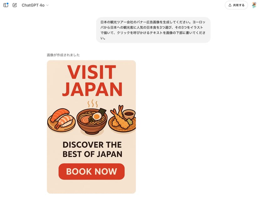 日本の観光ツアー会社のバナー広告画像を生成してください。ヨーロッパから日本への観光客に人気の日本食を3つ選び、その3つをイラストで描いて、クリックを呼びかけるテキストを画像の下部に書いてください。何も具体的な指示はしていないが、GPT-4oがキャッチコピーを考案し、ヨーロッパからの観光客に人気の日本食を「寿司・ラーメン・天ぷら」と自ら判断し、それらのイラストを自主的に描いてくれている。