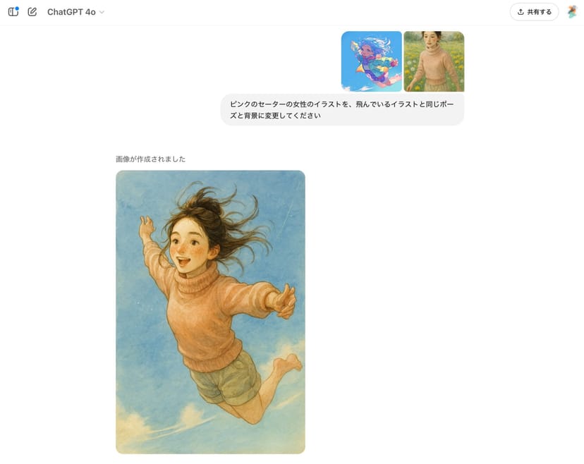 ピンクのセーターの女性のイラストを、飛んでいるイラストと同じポーズと背景に変更してくださいこれだけで、完璧に構図をトレースしたイラストが生成された。元のイラストの人物の特徴を崩すことなく、ポーズと背景だけが、参考画像と同じになっている。