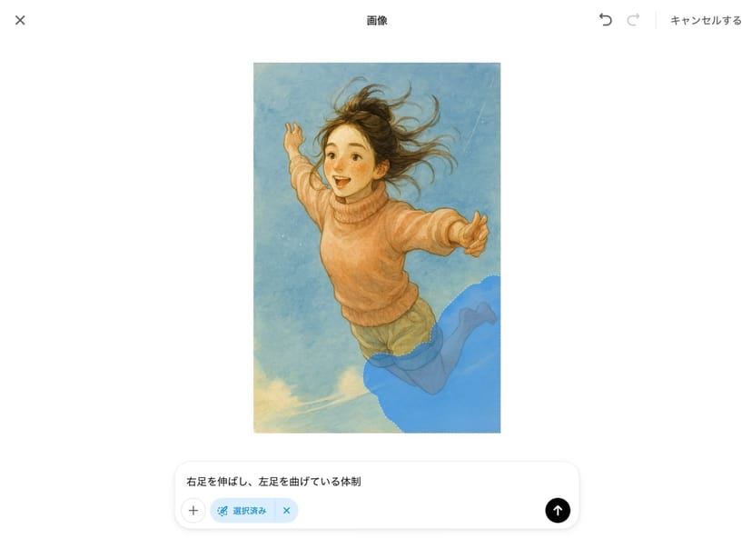 例えば、先ほど生成したスカイダイブのイラストについて、よく見ると右足が描写されておらず違和感があるので、選択ツールで下半身を選択した上で、「右足を伸ばし、左足を曲げている状態」という修正指示を行ってみた。