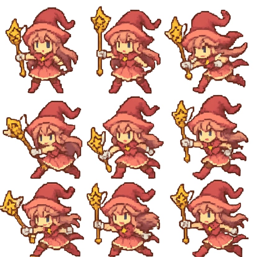 ファンタジーゲームに登場する魔法少女の主人公のピクセルアートを9種作成してください。いずれも戦闘シーンで利用できる様々な姿勢のバリエーションをつけてください。背景は透過してください。