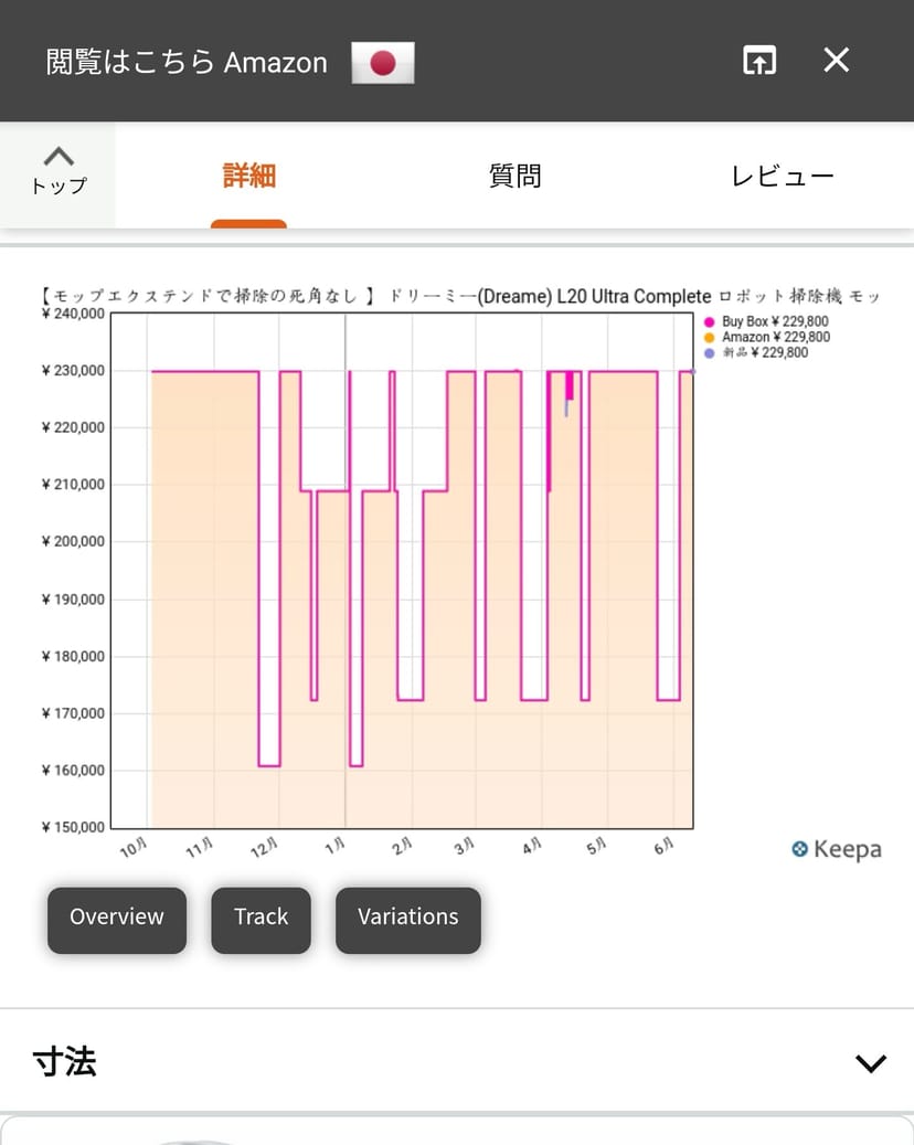 例えば、とあるロボット掃除機のページを開いて、Keepaの価格履歴を見てみると、直近で17万円台まで値下げされているが、現在の価格が23万円になっていることが分かった。