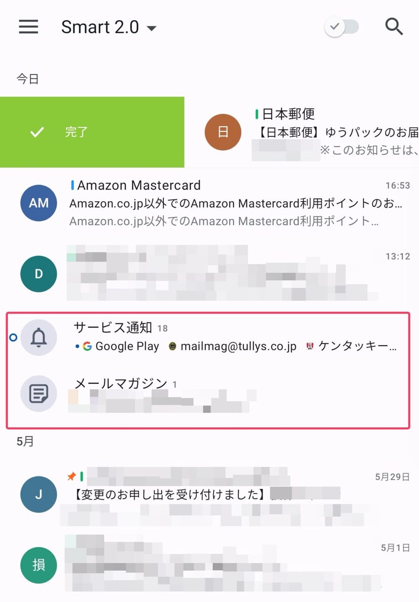 また、スマート受信ボックスをオンにすると、メルマガや通知メールなどをまとめて表示してくれるので、無駄なメールが隠され、受信ボックスがスッキリ片付く。