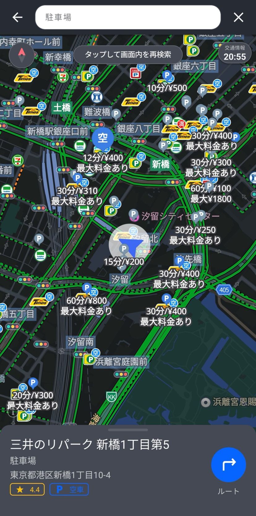 また、ルート検索だけでなく、周辺のガソリンスタンドや駐車場を検索することも容易である。「駐車場」と検索してみると、周辺にあるコインパーキングの料金、空車状況が表示される。
