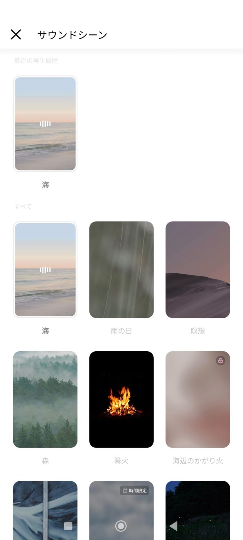 無料で利用できるサウンドの種類も結構豊富で、海、森、雨、焚き火、麦畑、虫の声、雪山、ピアノ音などが利用できる。