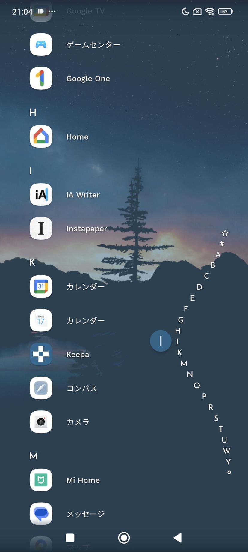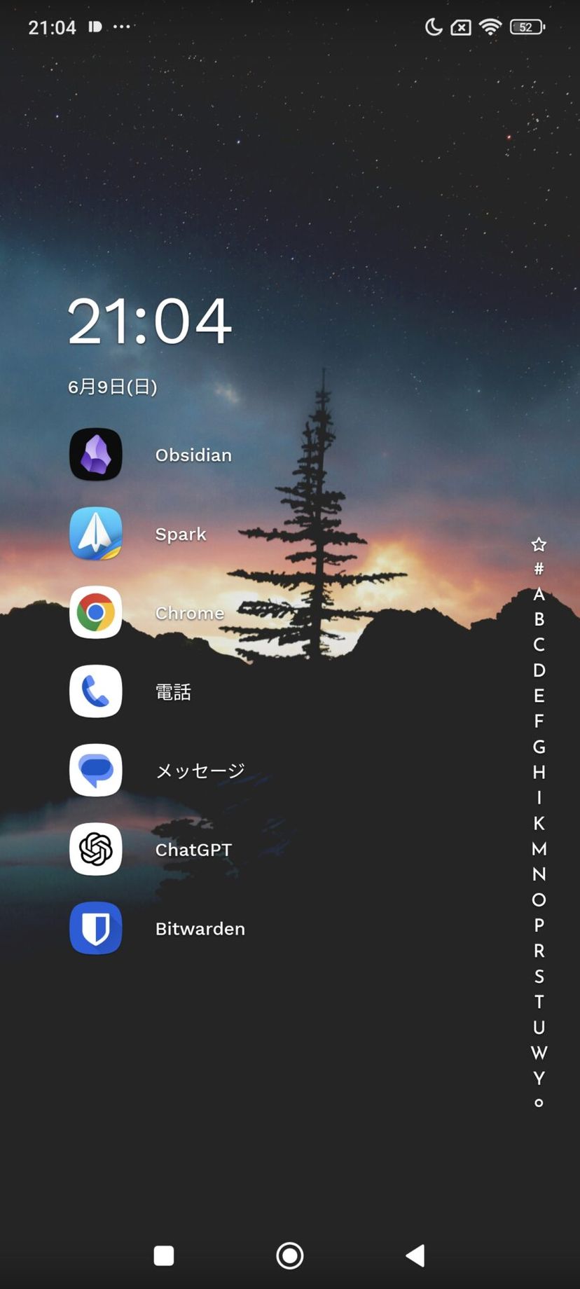 ホーム画面右側にアルファベットのスライダーがあり、ここに触れると、アプリ名の順番でソートされた全てのアプリにアクセスすることができる。