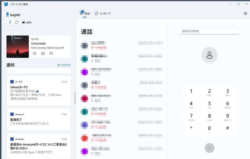 実際に、Windows側で「スマートフォン連携」アプリを立ち上げて、スマホと接続したのが以下の様子である。通知、通話履歴、メッセージ履歴、通話の発信などが、PCの画面で総覧できるので、いちいち仕事中にスマホをみる、という手間が軽減される。