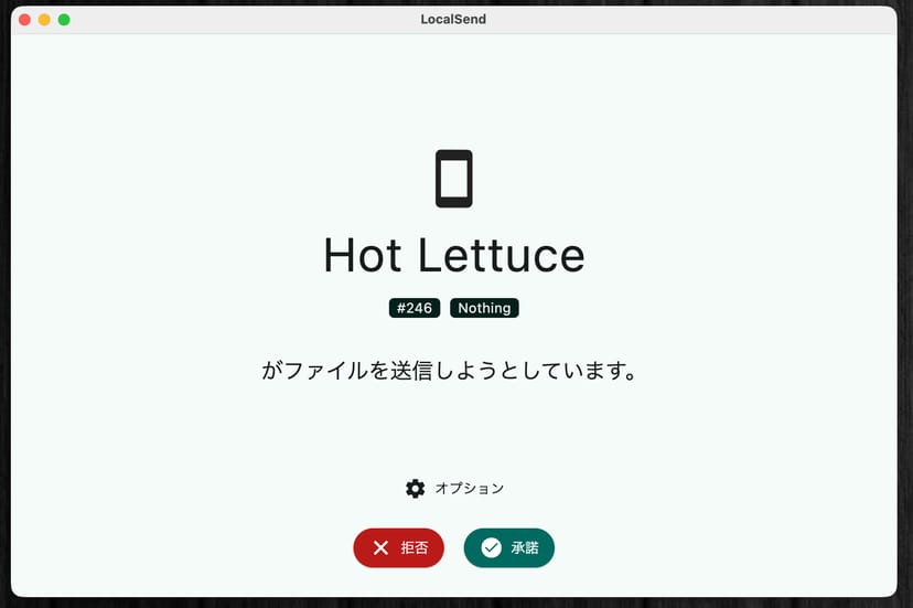 Mac側では、Androidスマホから送信されたファイルを受け取るかどうかを選択する画面が表示される。