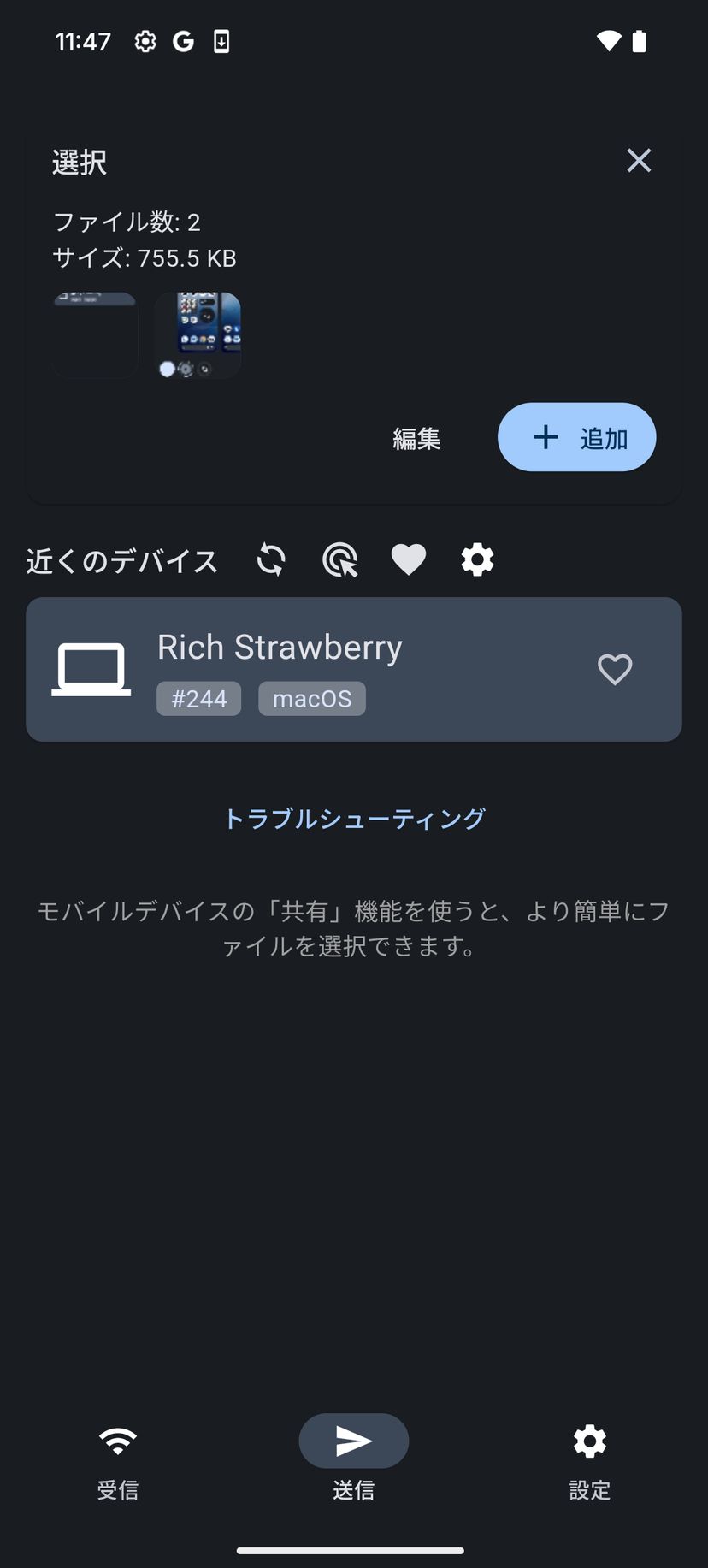 ファイルを選択して、送信先のデバイスをタップするだけでOKだ。