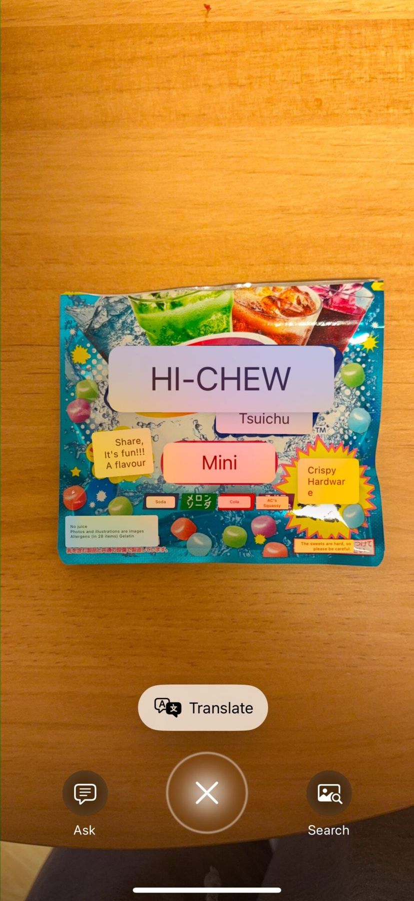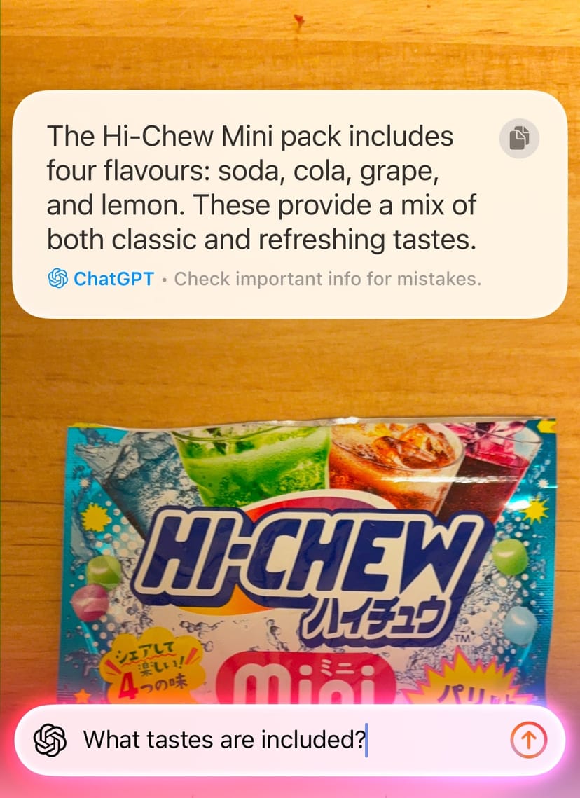 「Ask」をタップすると、これはハイチュウのミニパックだよ、という感じで、まず画像に関して基本的な情報をChatGPTが解説してくれる。