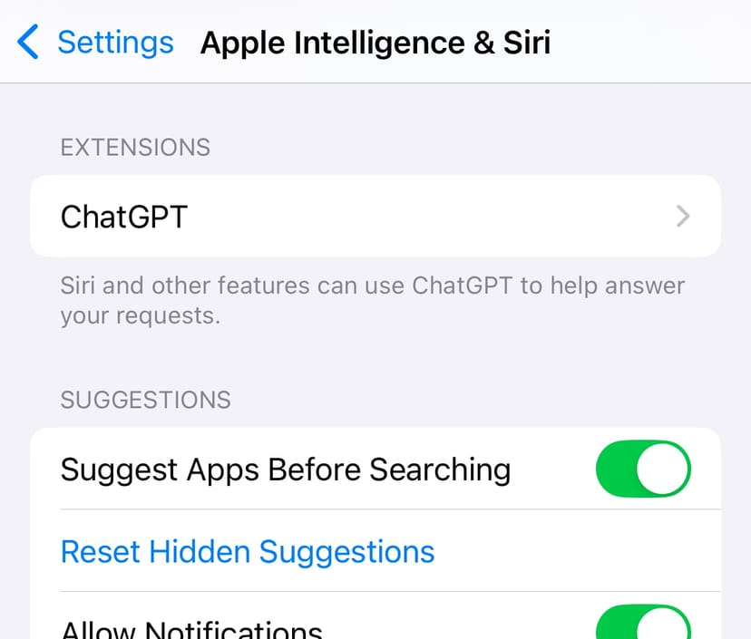 最新のOSにアップデートして、上記の手順でApple Intelligenceを有効にすると、「Settings」→「Apple Intelligence & Siri」の設定メニュー内に、「EXTENSIONS(拡張)」が現れ、ChatGPTを選択できるようになる。
