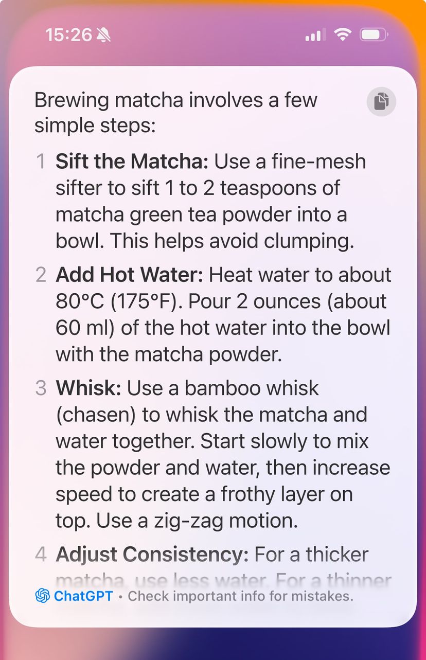 例えば、抹茶の淹れ方をSiriに聞いてみると、従来はWeb情報を表示してくれるくらいだったが、ChatGPTが詳細に抹茶の淹れ方を解説してくれた。