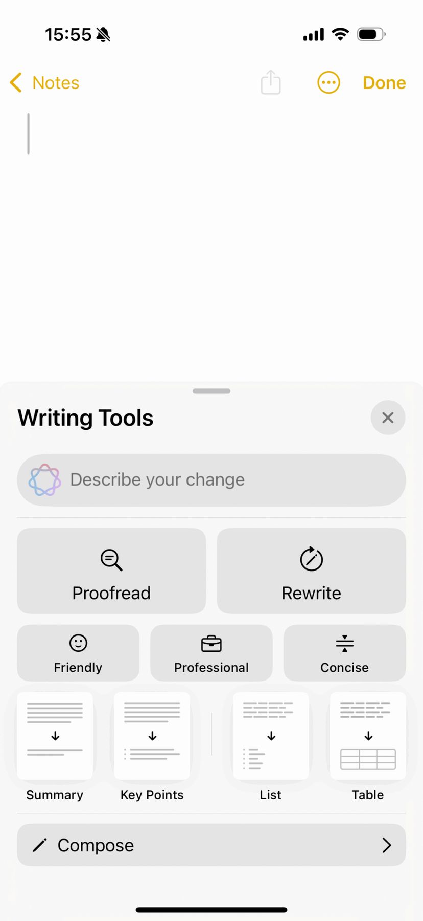 iPhoneやiPadでは、Writing Toolsは、テキストボックスがあれば、どこでも呼び出すことができる。