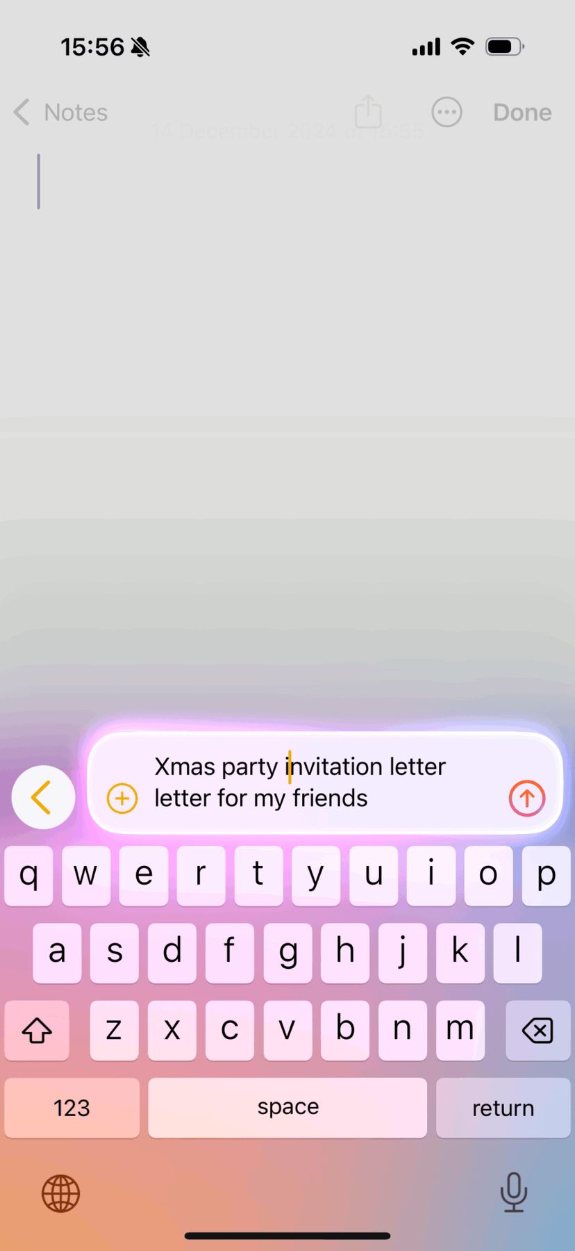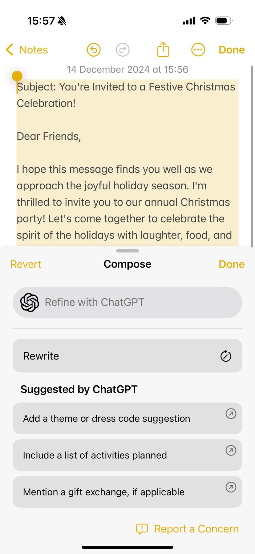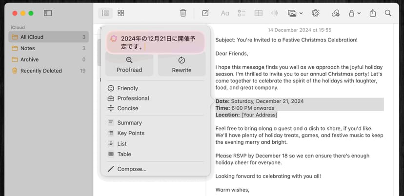 例えば、iPhoneのメモアプリでWriting Toolsを立ち上げ、「友人へのクリスマスパーティーの招待状」というテーマをお願いすると、
