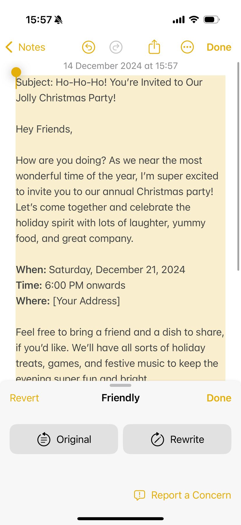 そして、一度作成した文章のスタイルを変更したいとき、例えば招待状がフォーマルすぎるのでもっとフレンドリーにしたい時は、「Writing Tools」のメニュー内で「Friendly」を選択すると、サンタ口調っぽいノリのいい文章に書き変わった。