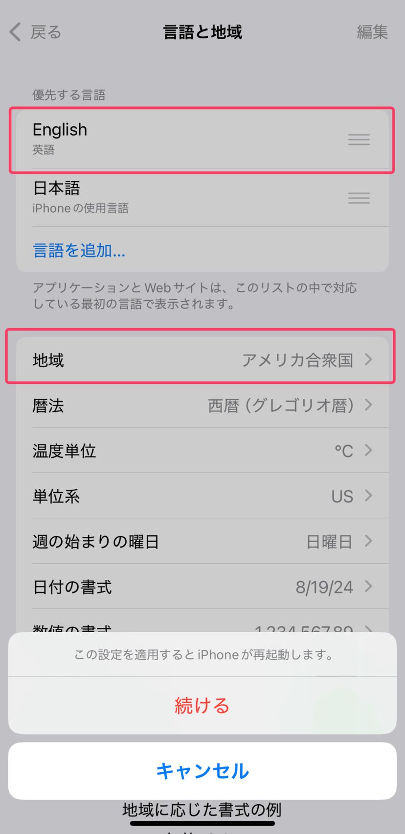 iPhoneの場合は、「一般」→「言語と地域」と進み、「地域」を「アメリカ合衆国」などに変更、「優先する言語」を「English」に変更する。