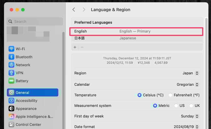 Macの場合も同様で、「言語と地域」の設定画面において、「地域」を「アメリカ合衆国」などに変更、「言語」を「English」に変更する。
