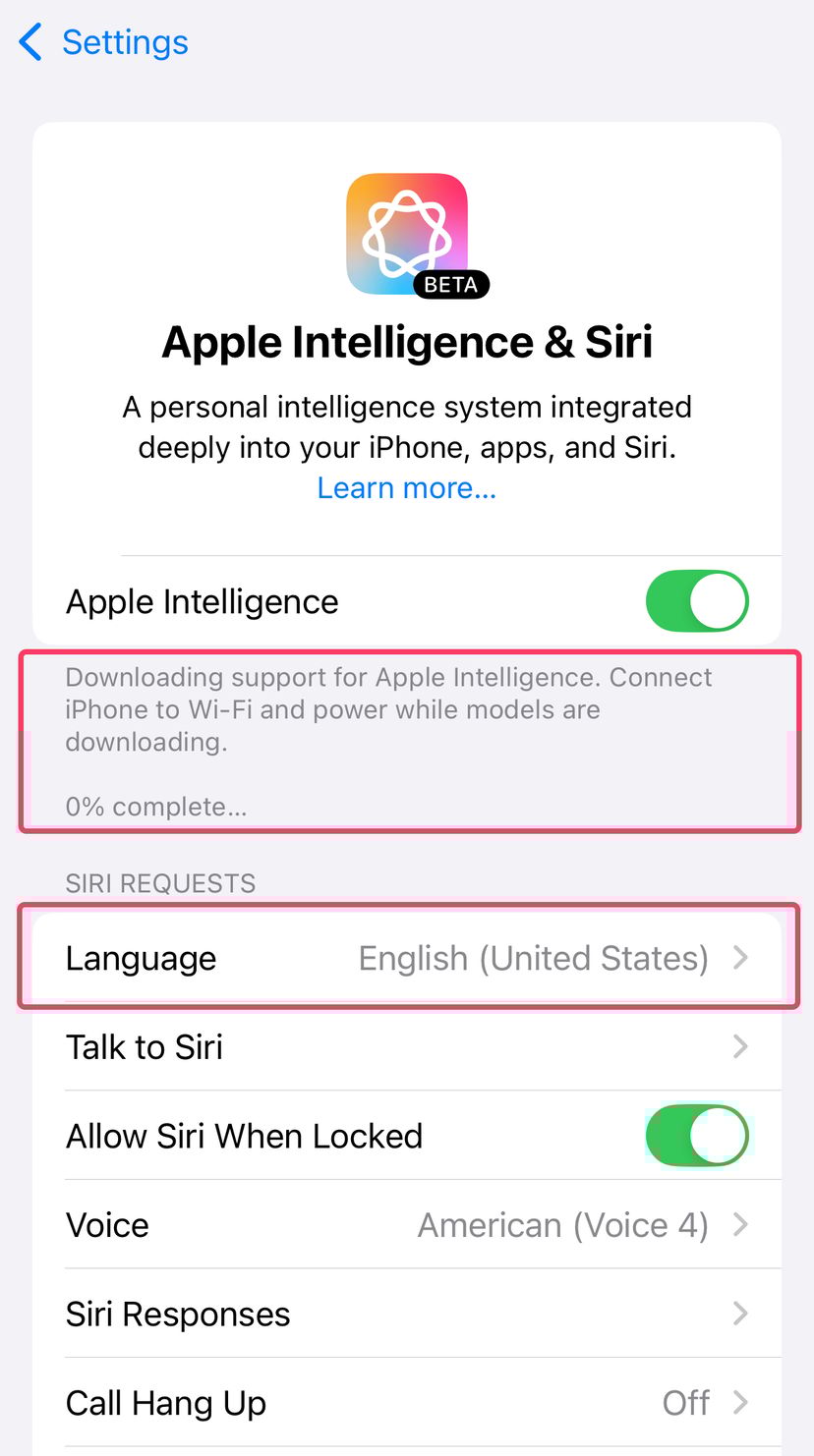 “Downloading support for Apple Intelligence. Connect iPhone to Wi-Fi and power while models are downloading.”がずっと表示されたままになり、0%や100%といった表示でランダムにループしてしまい、ダウンロードが完了せずスタックしてしまう不具合だ。