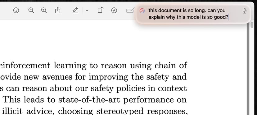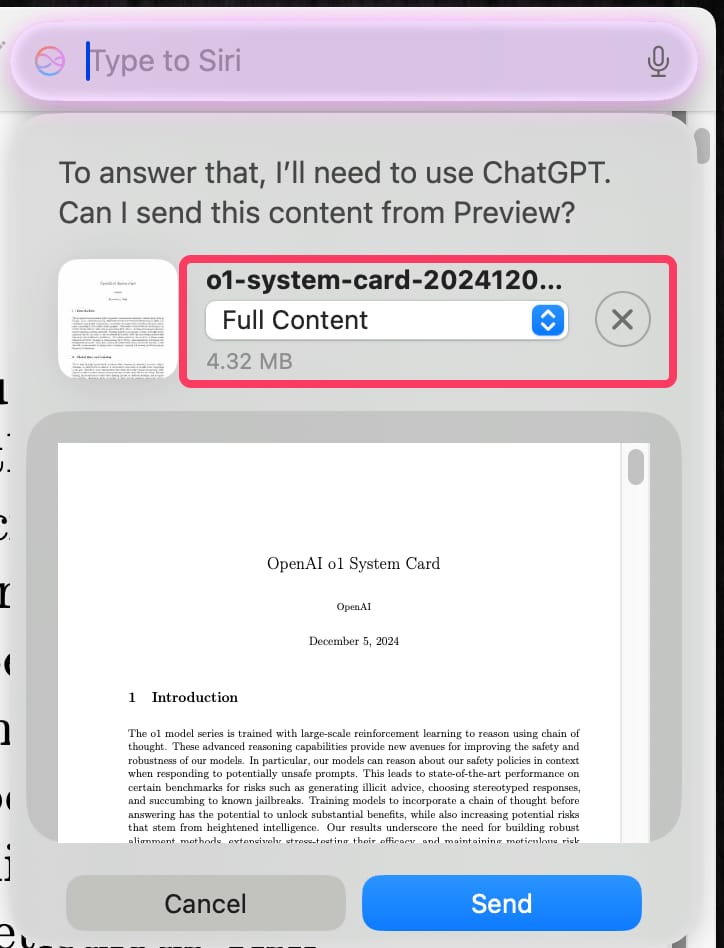 「12 Days of OpenAI」のライブ配信の中では、MacとChatGPTの統合のデモンストレーションとして、非常に複雑で長いPDFファイルを「プレビュー」アプリで開き、それをSiri・ChatGPTに要約させる、という手順が示された。