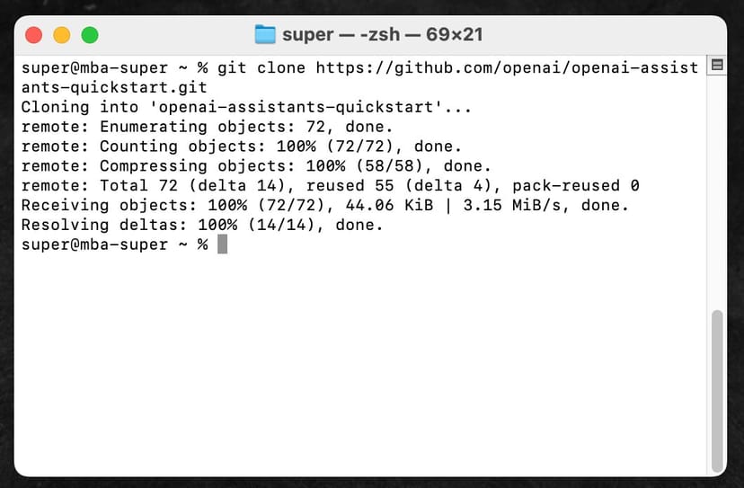 これは、Githubというソースコードの共有サイトから、Assistants API Quickstartの公開されているコードを、丸ごと自分のMacのホームフォルダ内にクローン(コピーしてダウンロード)してくるコマンドである。