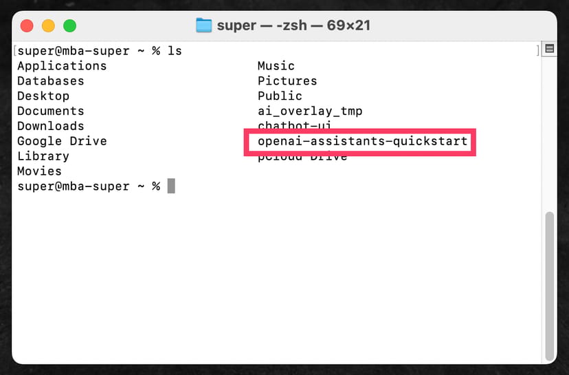 先ほどのgit cloneコマンドで、ネット上にあるフォルダをホームディレクトリにダウンロードしてきたので、openai-assistants-quickstartというフォルダが新たに一覧に加わっているのが分かる。
