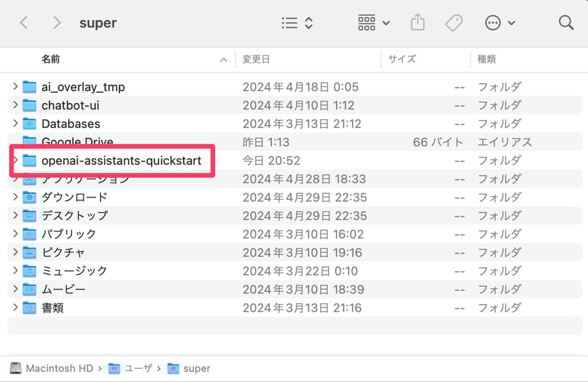 実際、Finderでホームフォルダを開くと、「openai-assistants-quickstart」というフォルダが新設されていることが分かる。