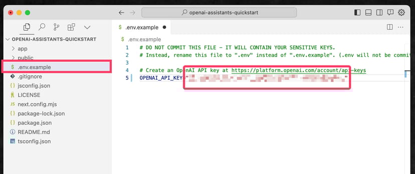 前の手順でダウンロードして作成した「openai-assistants-quickstart」フォルダを、テキストエディタで開くと、.env.exampleという隠しファイルがある。