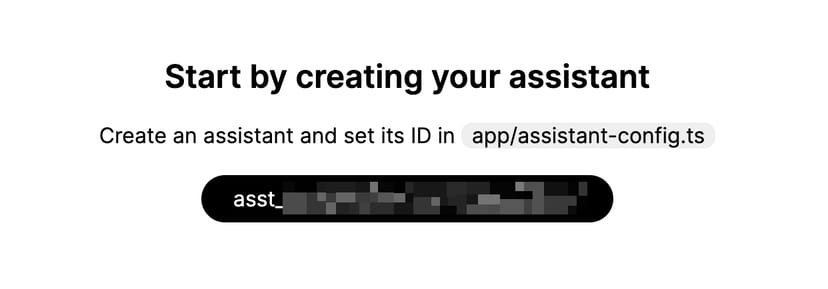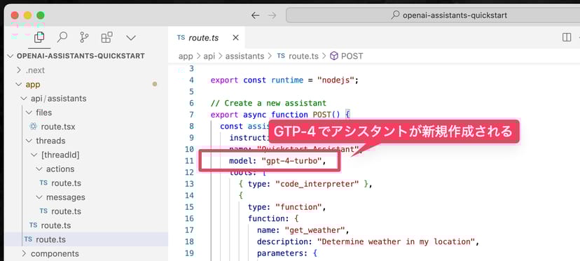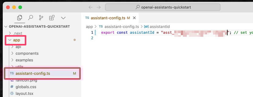 VS CodeやCursorなどのテキストエディタで、再びopenai-assistants-quickstartフォルダを開き、/appフォルダの中にあるassistant-config.tsというファイルの中に、ここで生成されたアシスタントIDをペーストして上書き保存する。