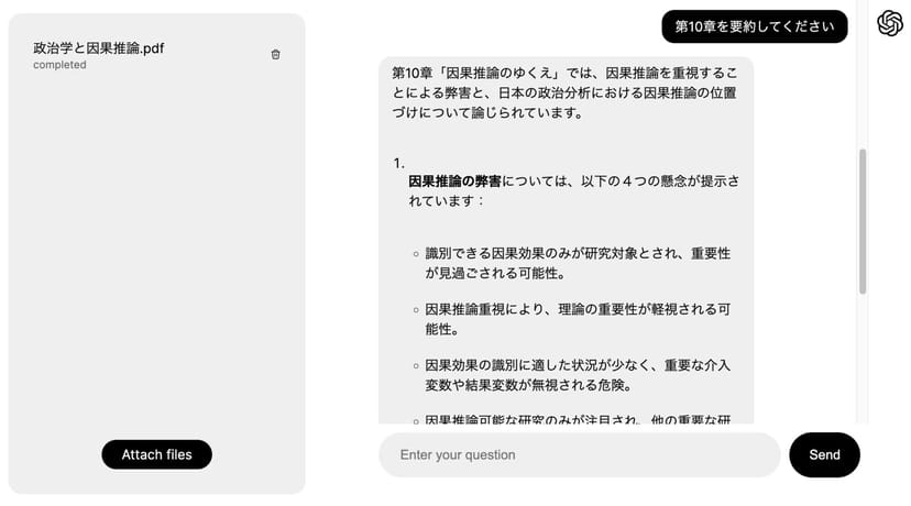 『政治学と因果推論』という本をスキャンしPDF化したデータを添付して、「第10章を要約して下さい」と指示すると、ちゃんと実際の本の内容を参照して、第10章の要約を行なってくれた。