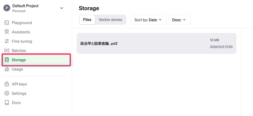 OpenAIのプラットフォームにログインして、「Storage」メニューを確認すると、Assistants API Quickstartで利用したファイルが保管されているので、これを削除しておくようにする。