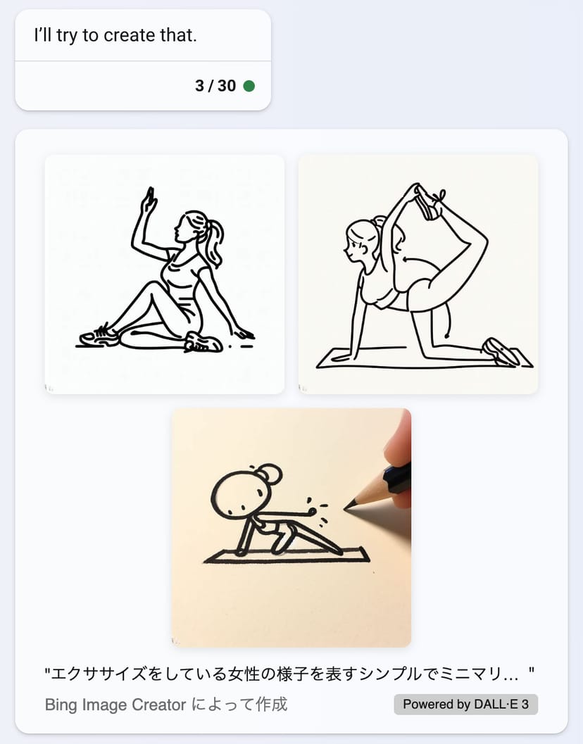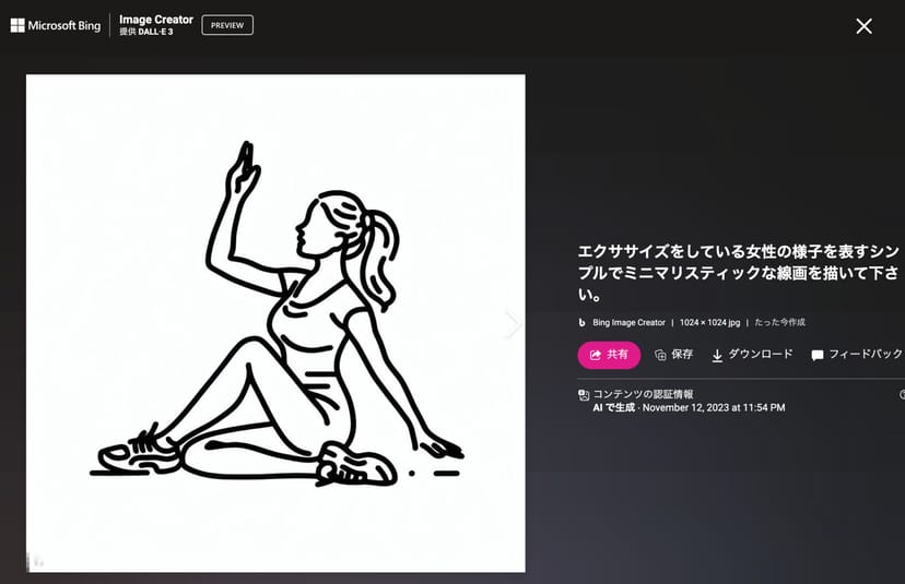 今回は、運動についてのプレゼンテーション資料を作ると仮定して、エクササイズ中の女性を連想させるようなシンプルなイラストを生成させることにする。