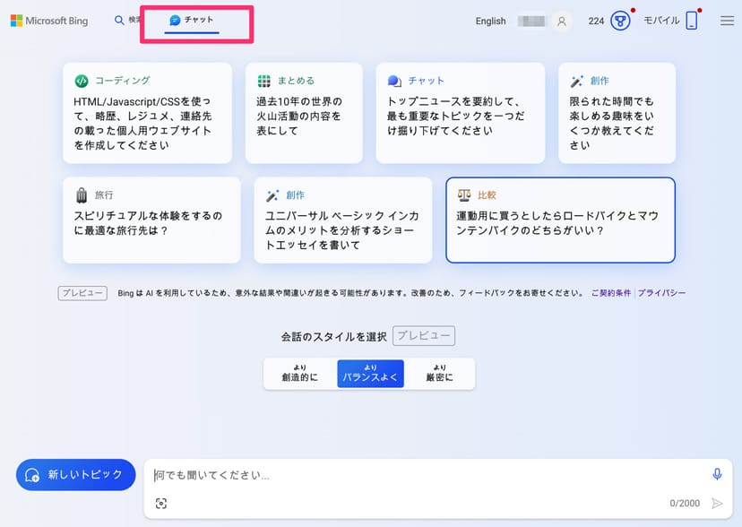 そもそもBing Chatは、Microsoft Bingのトップページで、「検索」と並んで「チャット」と表示されているアイコンをクリックすると利用することができる。