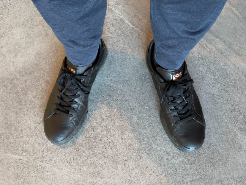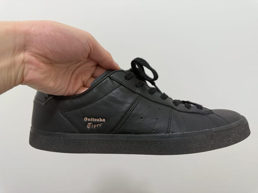 オニツカタイガーのLAWNSHIP 3.0は、プレーントゥの革靴のようなツヤ感と、それでいてプライベートで履いていてもオシャレ感のある金の刺繍が非常に気に入っている。