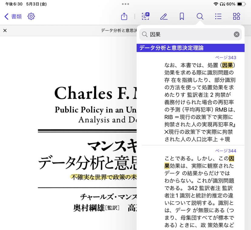 文書内の検索もサクサク動作するので、本の中でキーワード検索をしたい時にも、iPad上でサクッと検索し、目的のページにジャンプすることができる。