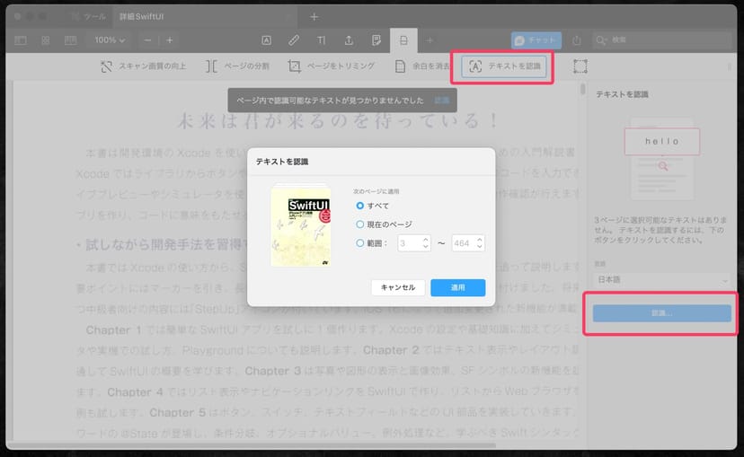 OCRの使い方は、PDF Expertの場合とほぼ同様で、「テキスト認識」メニューをクリックすると、識別する言語を選択して、書籍の指定した範囲にOCR処理をかけることができる。