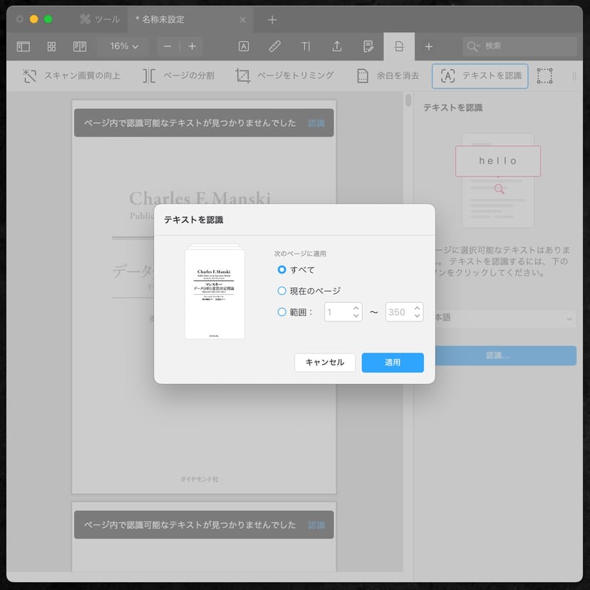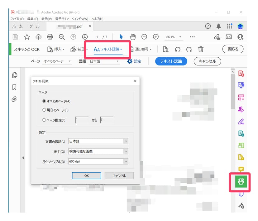 画像を全て統合したPDFファイルを開いたら、そのファイルにOCRによるテキスト認識をかける。