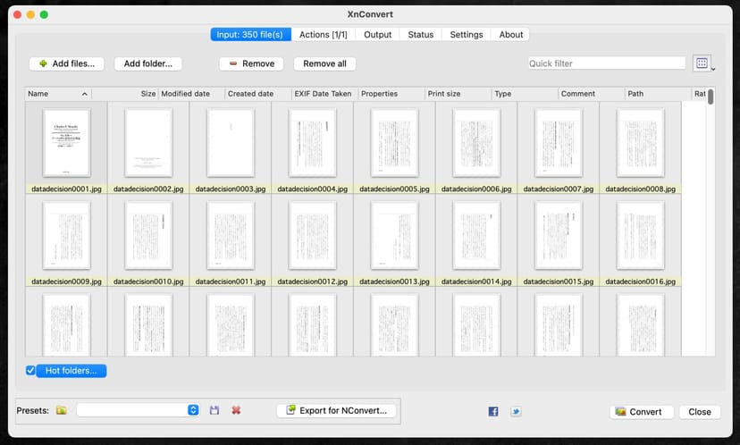 XnConvertは、書籍の全ページなど、数百枚の画像を一気に読み込むことができる。