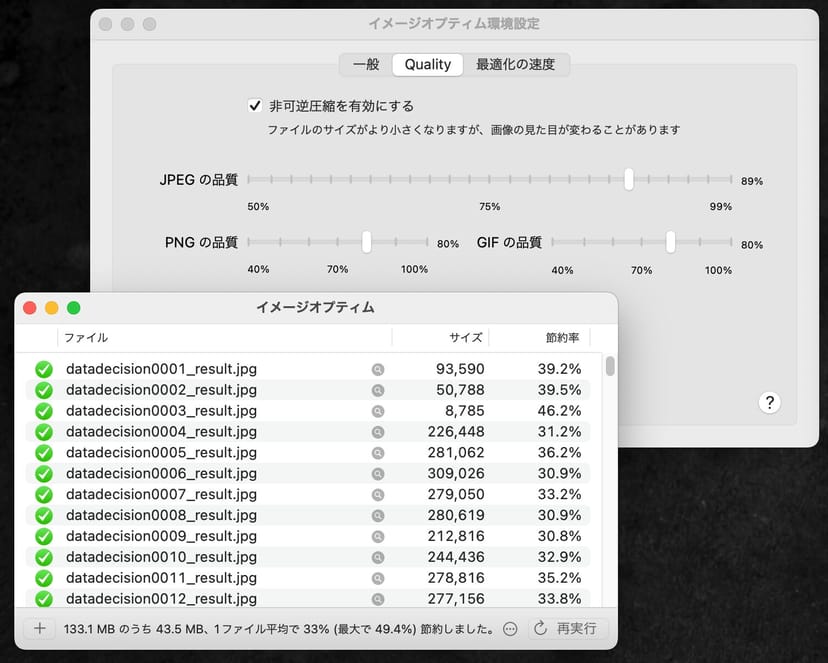 設定で圧縮率の高い非可逆圧縮をオンにして、JPEGの品質を90%に設定して、350枚の画像をすべてImageOptimに最適化させると、133MBから90MBまで容量を圧縮することができた。