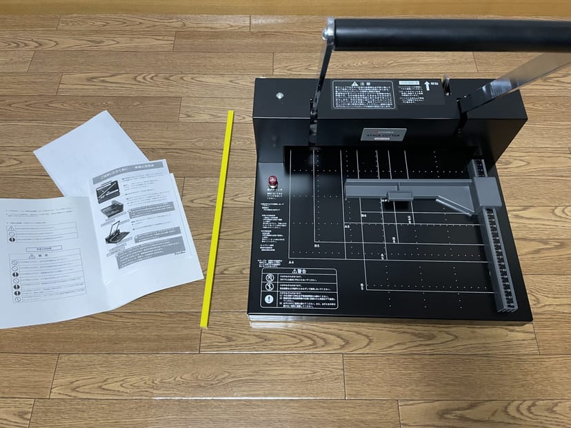 ちなみに、いくら本格裁断機といえど、ハードカバーの本や、非常に分厚い本は、予めカッターで解体した上で裁断する必要があるので、最低限、カッターナイフと下敷き(カッティングマット)は追加で必要になる。