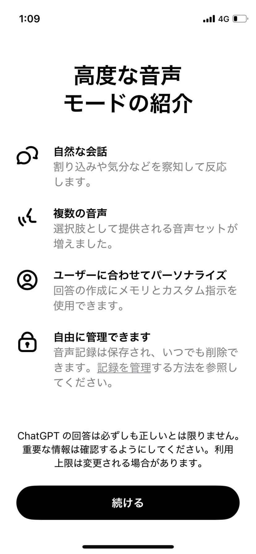 日本語版のアプリでは、アップデート後のVoice機能が利用可能になると、「高度な音声モードの紹介」が表示されるはずだ。