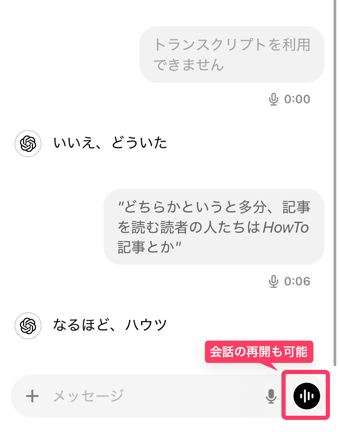 従来の標準音声モードでは、音声モードをオンにするたびに新しいスレッドが開いてしまい、以前の会話の続きを行うことができなかった。