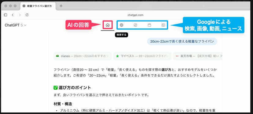 例えば、購入を検討中の商品について主な候補を知りたいとする。「20cm-22cmで長く使える軽量なフライパン」と検索バーに打ち込んでみる。
