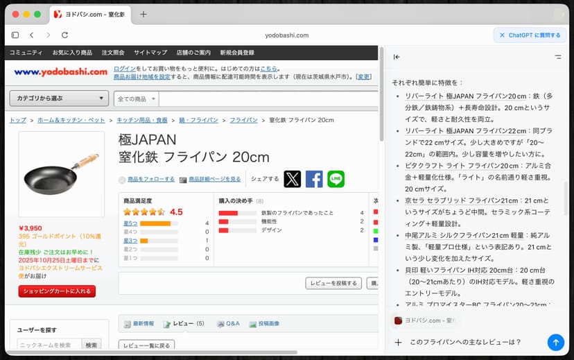 ChatGPTが紹介してくれたフライパンの一つを開き、「このフライパンへの主なレビューは?」と尋ねてみると、ページ内に表示されているレビューの要約が得られる、といった具合だ。
