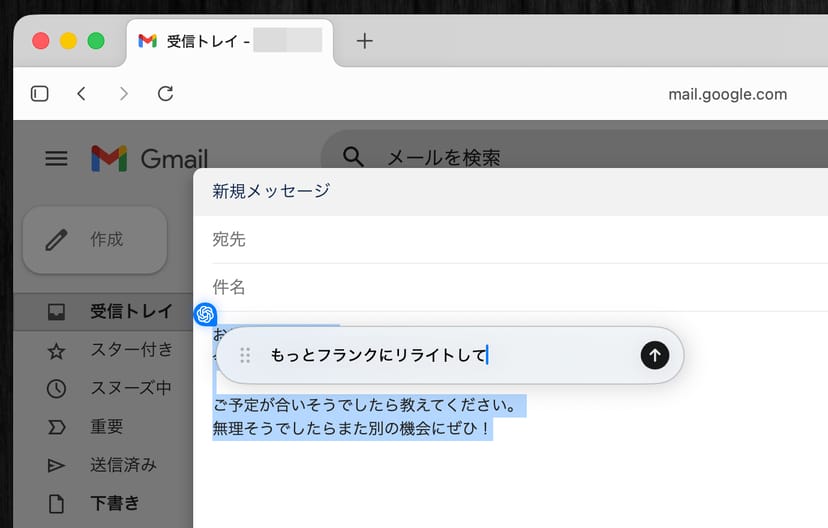 例えば、知人を映画に誘うメールの下書きの途中で、メール本文を全選択し、「もっとフランクにリライトして」とChatGPTに頼んでみる。